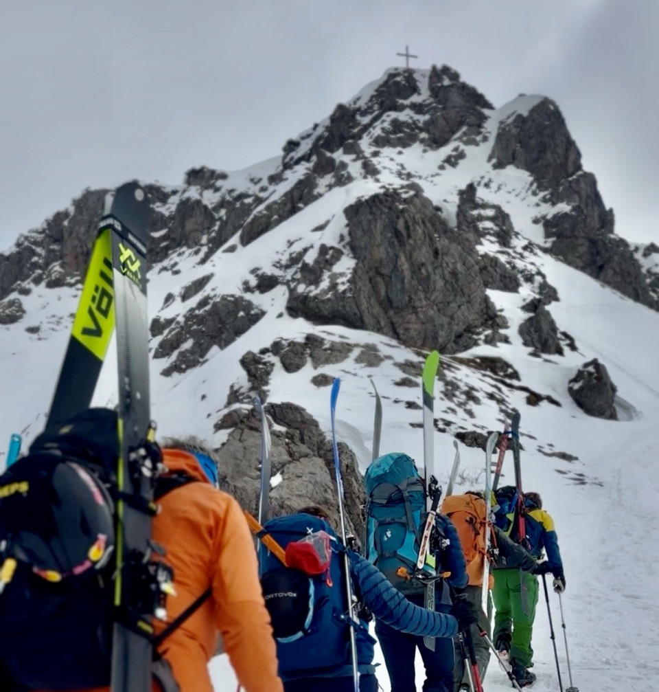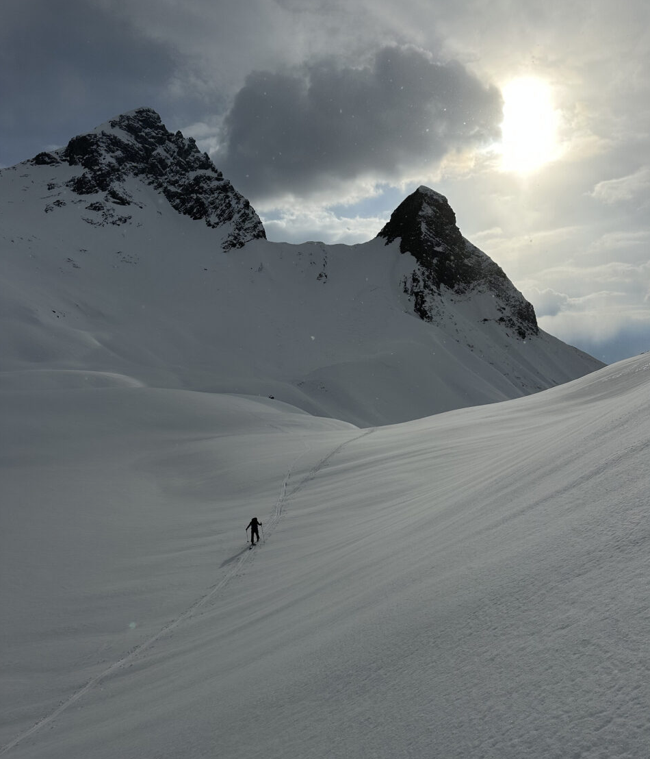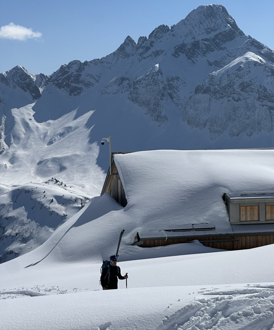 Von der Kanzelwand steigen wir mit Ski am Rucksack zur Kanzelwandscharte auf. Von dort führt uns die Route zunächst hinab: über aufgefirnte Hänge, mit Querungen und kurzen Passagen durch Latschen bis in den Warmatsgund. Die Bewölkung wird dichter, doch die Stimmung bleibt ungetrübt. Mit Vorfreude auf den Winterraum steigen wir weiter zur Fiderepasshütte.