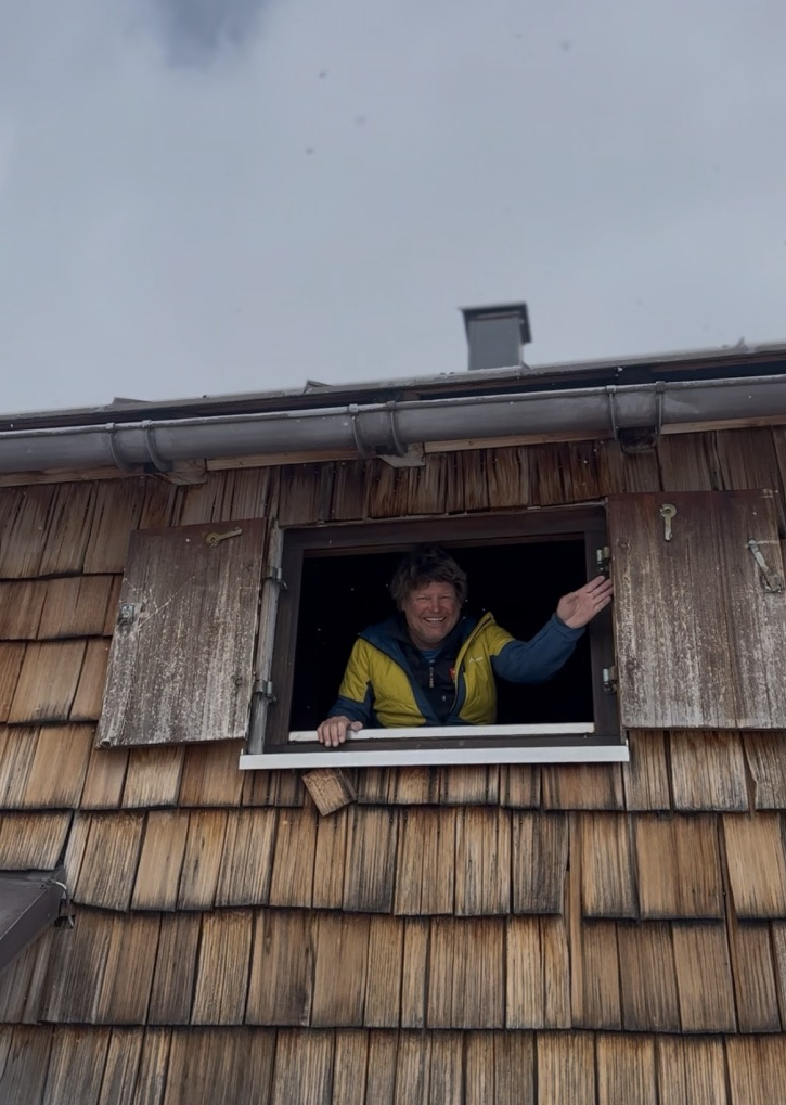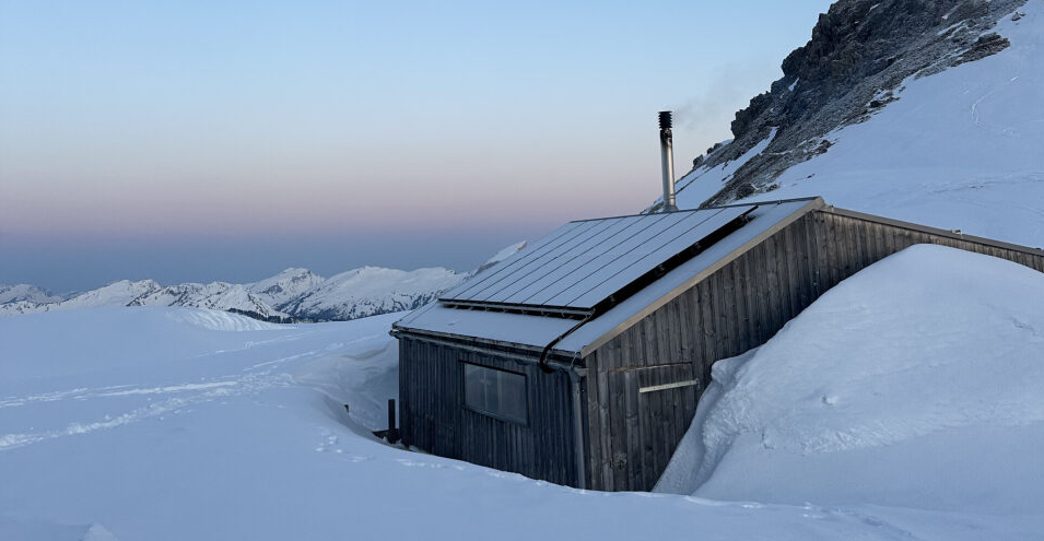 Doch am Morgen zeigt sich schnell: Die Wolkenbasis hängt tief zwischen den Gipfeln, leichter Schneefall zieht durch. Während im Tal vereinzelt die Sonne durchkommt, fühlt es sich hier oben eher nach tiefstem Winter an. Die Entscheidung ist eindeutig: der Grat muss warten.