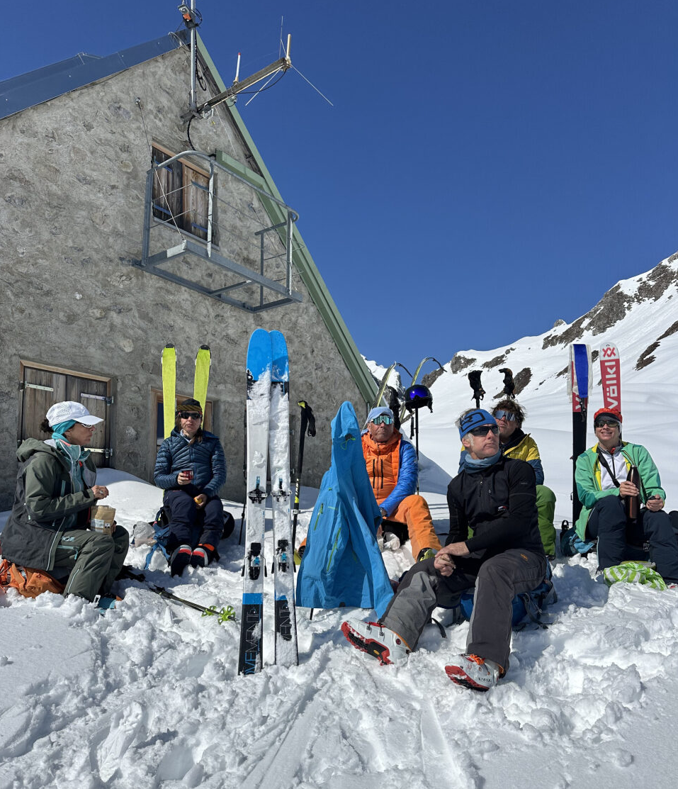 Erleichtert genießen wir die Pause an der Mindelheimer Hütte, bevor wir über firnige Hänge – unterbrochen von einigen Tragepassagen durch Latschen – zur Speicherhütte abfahren.