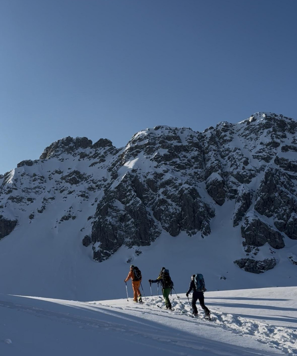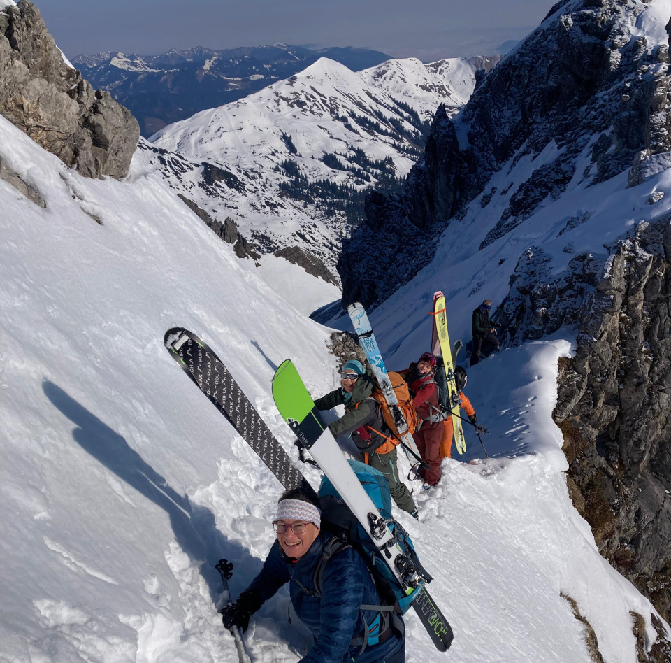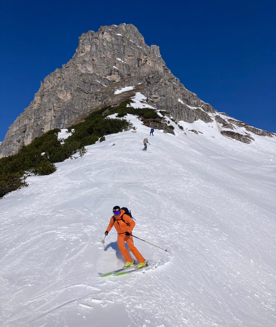 Was folgt, sind traumhafte Firnhänge: glitzernder Schnee, weite Hänge, perfekte Bedingungen. Die Abfahrt führt uns hinunter zur „Schwangeren Bettlerin“. Mit Blick auf die Allgäuer Hochalpen und begleitet von einem Bartgeierpaar queren wir weiter in Richtung Mindelheimer Hütte.