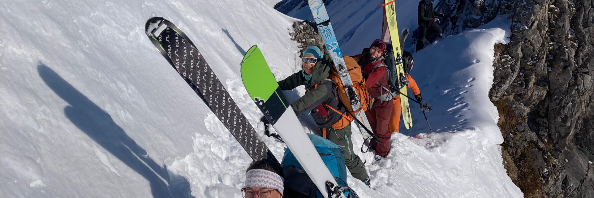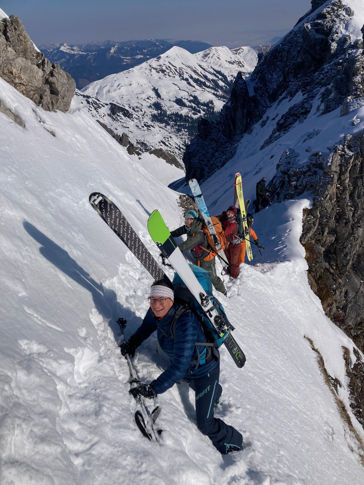 Dort werden die Ski erneut am Rucksack befestigt, und wir steigen zu Fuß ein Stück über den steilen Grat hinauf.
