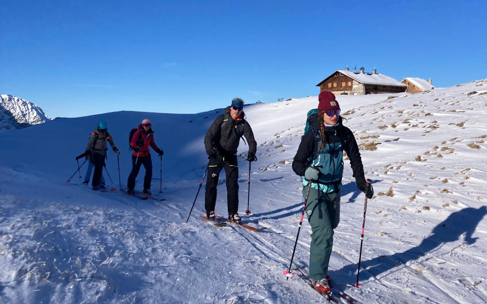 Die Nacht verlief ruhig und am nächsten Morgen ging es nach Frühstück und Winterraumreinigung (don´t leave any footprints) wieder auf Tour – jetzt wieder mit vollem Gepäck. Ziel war die Scharte zwischen Alpgund- und Roßgundkopf auf knapp 2100 Hm. Der Anstieg in Nord-West-Ausrichtung im Schatten mit Neigungen bis über 40 Grad gestaltete sich als wahre Spitzkehrenorgie in wieder teils verharschtem Terrain; mit Harscheisen aber gut machbar. Oben angekommen boten die Gipfel zu allen Seiten wieder ein Traumpanorama im strahlenden Sonnenschein. Jetzt hatten wir rund 700 hm Abfahrt vor uns, davon die ersten 400hm durch nahezu unverspurten Tiefschnee. Kurzer Gegenanstieg und dann durch die Büsche runter ins Wank, auf der Forststraße bis zur Fellhorn-Talabfahrt die letzten Meter zur Talstation mit Einkehrschwung.