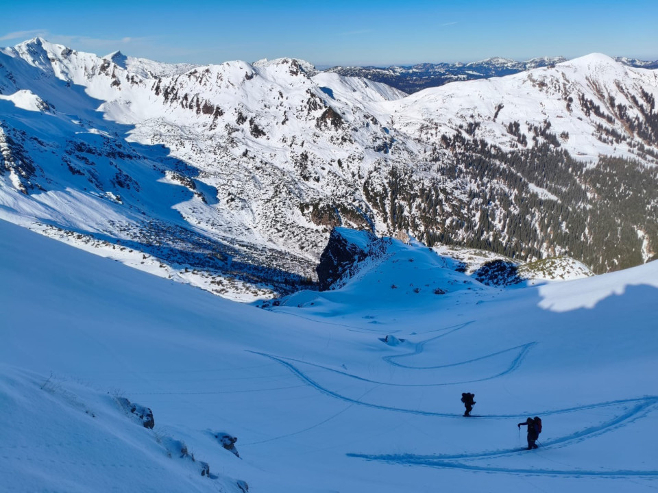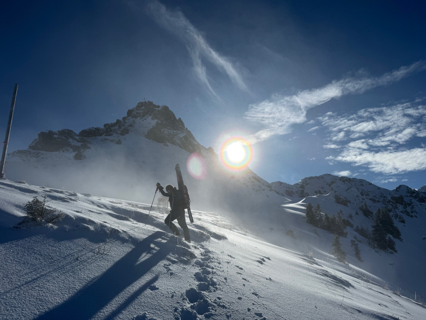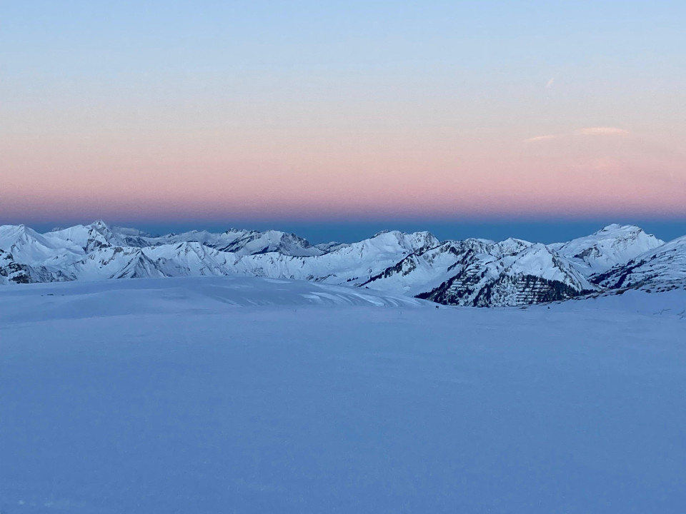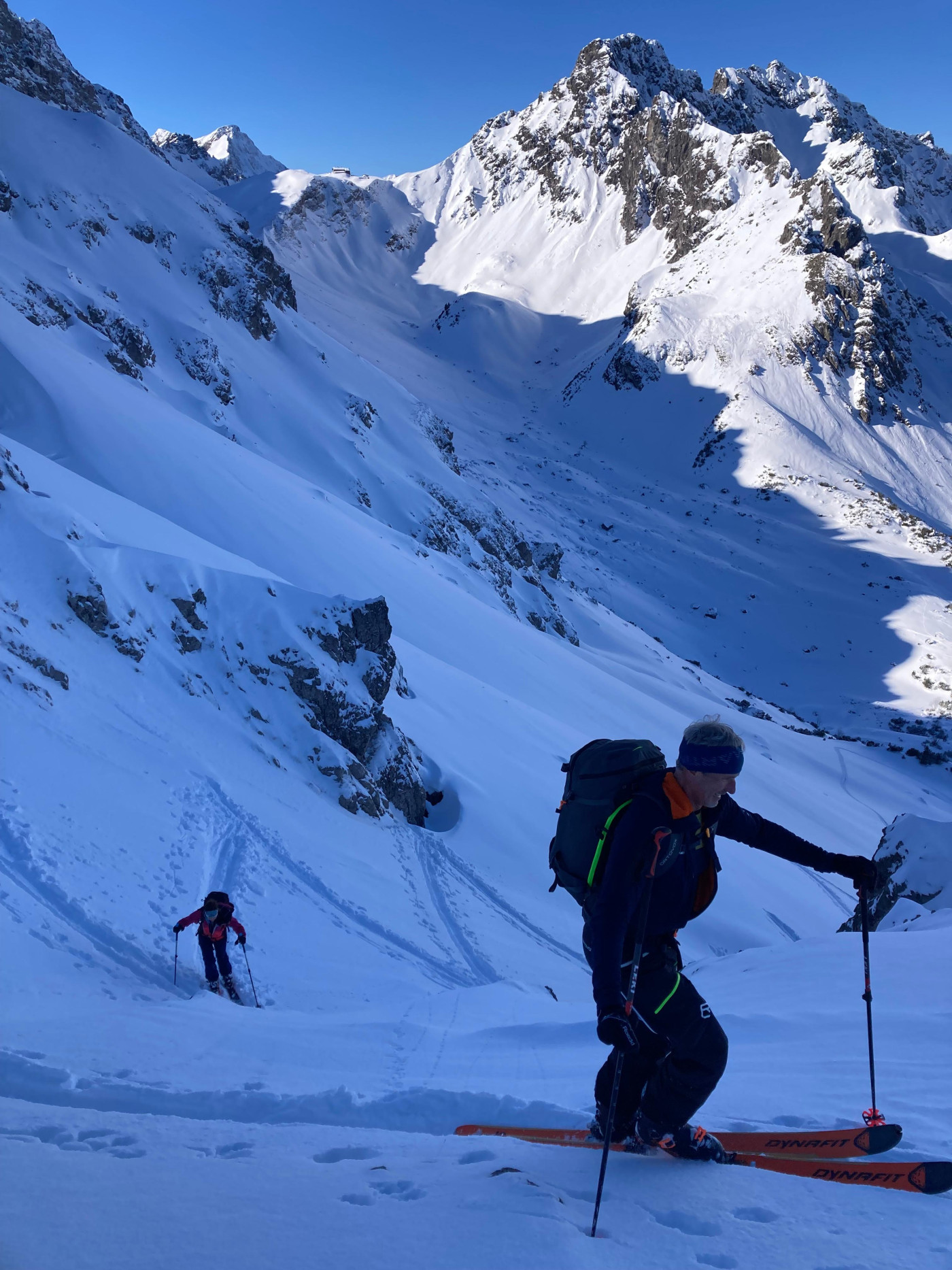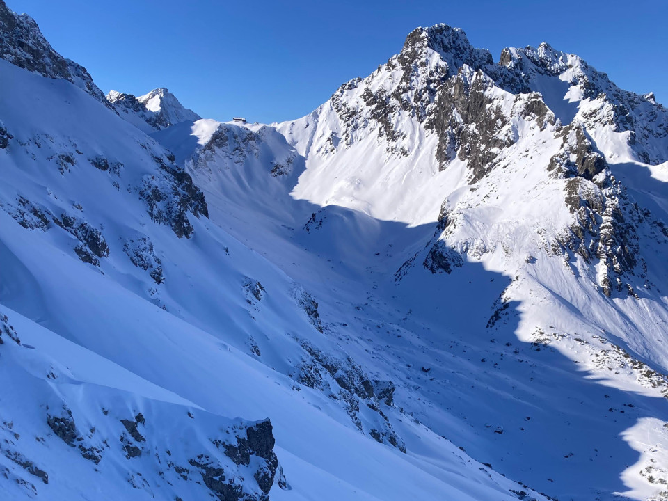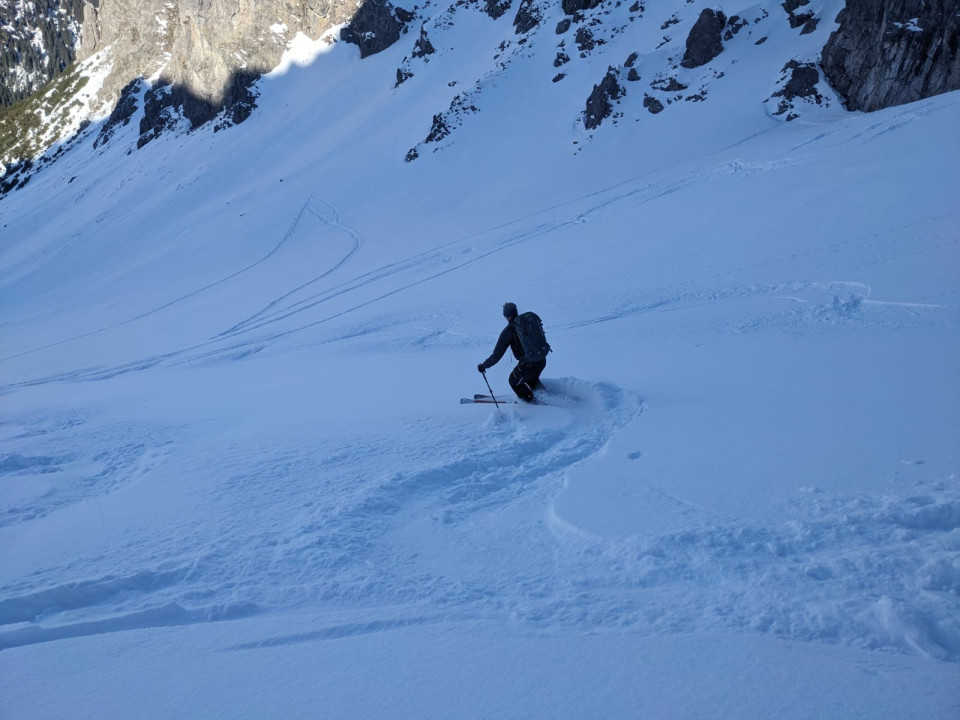 Ski an und dann die ersten rund 350 hm Tiefschneehang ….was für ein grandioser Start ins Wochenende. So leistungslos sollten uns die weiteren Abfahrten des Wochenendes nicht mehr in den Schoß fallen.