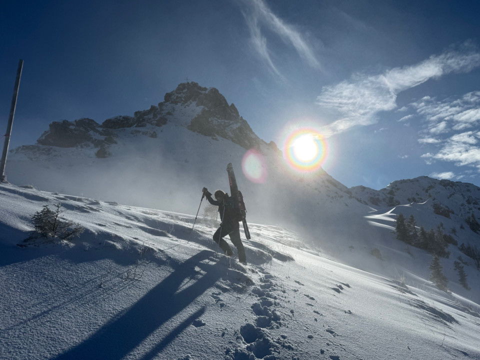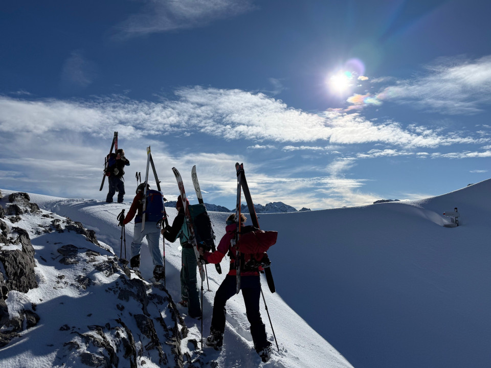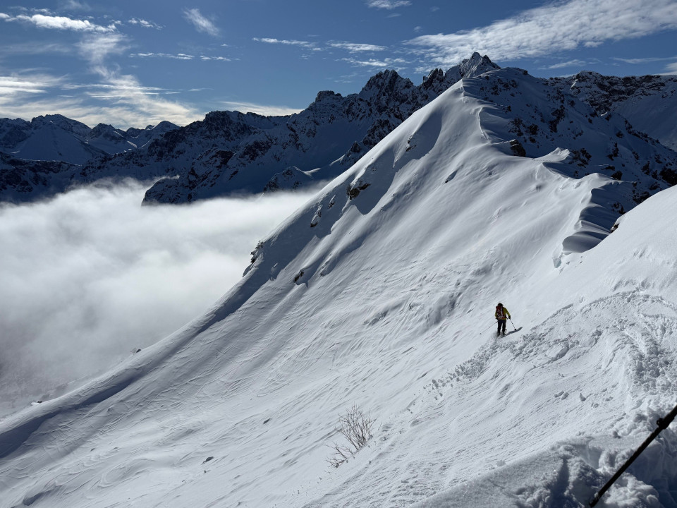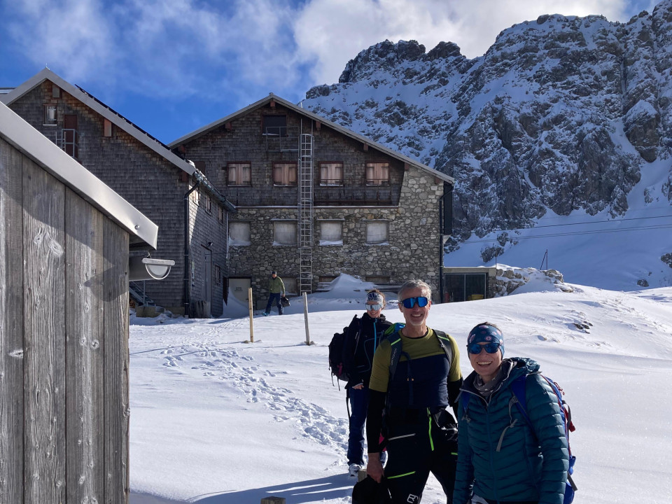 Da für das Wochenende Selbstversorgung angesagt war, musste das Essen noch auf die Rucksäcke verteilt werden. Dann zügig ab in die Bahn und auf den Berg. Am Ausstieg der Zweiländerbahn hieß es Ski an den Rucksack und zu Fuß durch den Tiefschnee die ersten 25 Minuten hoch auf Sattel der Kanzelwand. Während im Tal und bei der Auffahrt noch trübes Wetter herrschte, hatten wir - am Sattel angekommen – strahlenden Sonnenschein und einen tollen Rundumblick über die Wolken auf die umliegenden Berge, während unter uns in Richtung Südost ein traumhafter sonniger Tiefschneehang hinab ins Wank wartete.